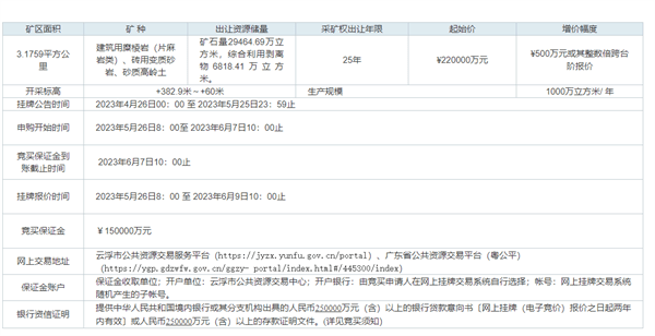 另外,采礦權(quán)出讓礦區(qū)面積3.1759平方公里(4763.84畝),礦區(qū)開采范圍內(nèi)的土地以租賃方式使用。土地的租金、青苗補(bǔ)償款等費(fèi)用合計(jì)人民幣70000萬元,由競(jìng)得人承擔(dān)并在簽訂《非油氣采礦權(quán)出讓合同》后,在2023年7月30日前支付第一期款項(xiàng)人民幣35000萬元到云浮市云城區(qū)財(cái)政局指定銀行賬號(hào),第二期在2023年10月30日前繳納剩余款項(xiàng)人民幣35000萬元。云浮市云城區(qū)人民政府負(fù)責(zé)協(xié)調(diào)完成礦區(qū)范圍(3.1759平方公里)租地后交由采礦權(quán)競(jìng)得人使用,具體租地情況由競(jìng)買申請(qǐng)人自行向云浮市云城區(qū)人民政府了解。